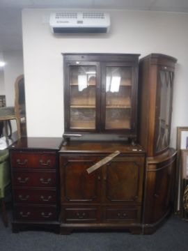 A corner display cabinet, hi/fi cabinet, TV cabinet and a bookcase fitted a drawer