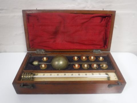 An antique mahogany Sikes Hydrometer by L. Oertling.