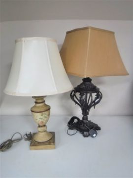 A decorative metal table lamp with shade together with a painted wooden table lamp with shade