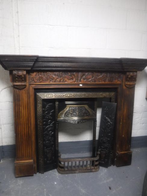 A cast iron Victorian style fire insert in carved pine surround