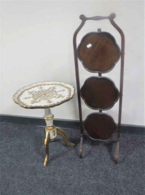 A Victorian mahogany three tier folding cake stand together with a painted wine table