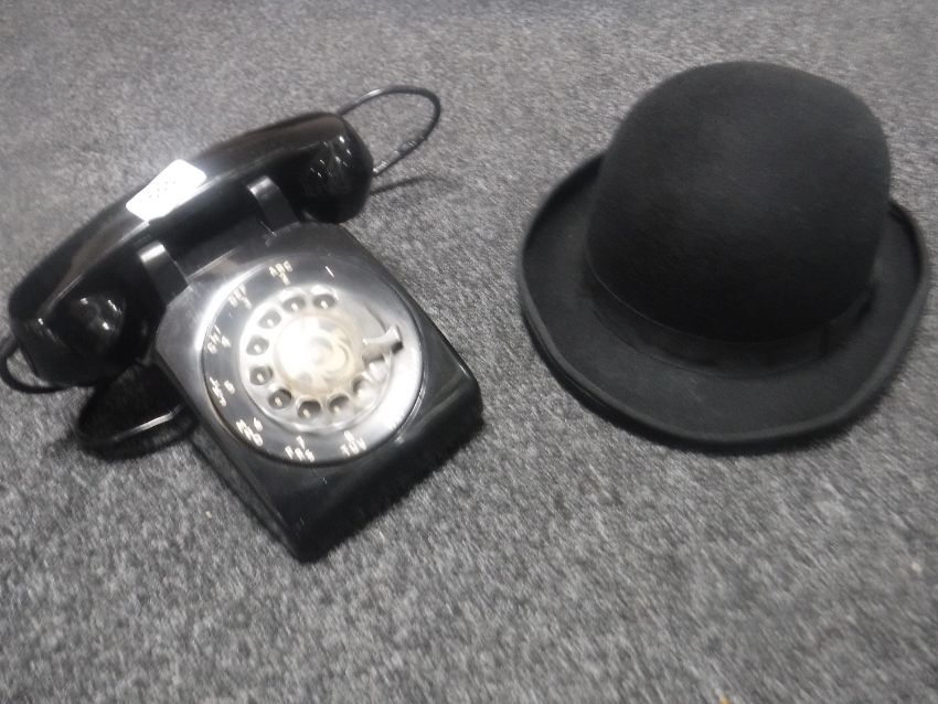 A vintage black telephone together with a bowler hat (with tags), size 6 7/8. (2)