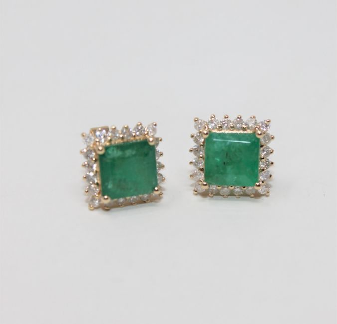 A pair of 14ct yellow gold emerald and diamond earrings featuring 1 square cut emeralds 3.51ct and 40 round brilliant cut diamonds .58ct.