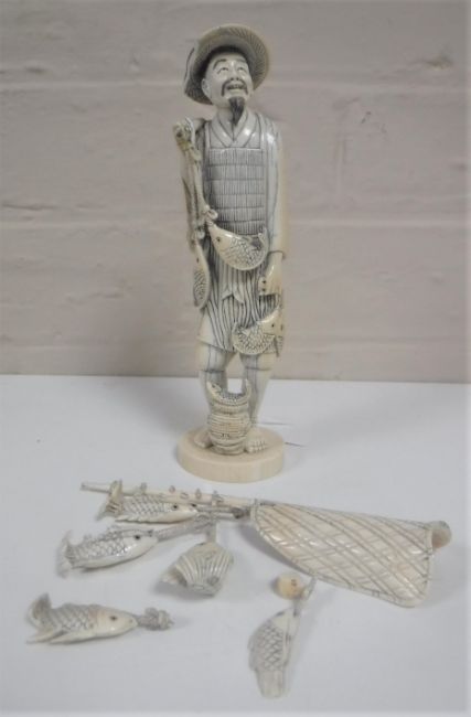 An antique ivory figure modelled as a fisherman with fish, signed to base, height 20.5 cm.