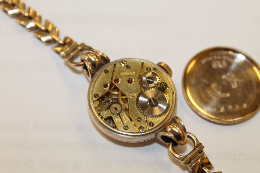 Gold watch 20.3g gross. The inner case back is hallmarked 9ct gold. The bracelet does not appear to be hallmarked but in our opinion would test as 9ct gold. There is no inscription to the case back. The case has a few scratches to the back where it has been opened with jeweler's blade. The dial is discoloured. The watch winds, runs and adjusts. The movement appears clean.