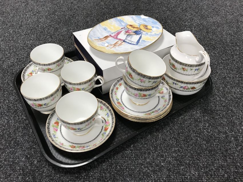 A tray of fourteen piece Grosvenor Old English china tea service together with two boxed Royal Worcester plates