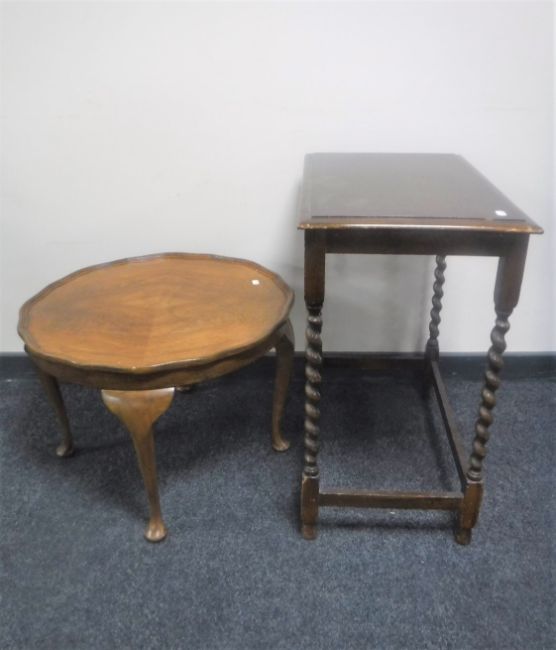 An oak barley twist occasional table together with a walnut pie crust edge Queen Anne style coffee table