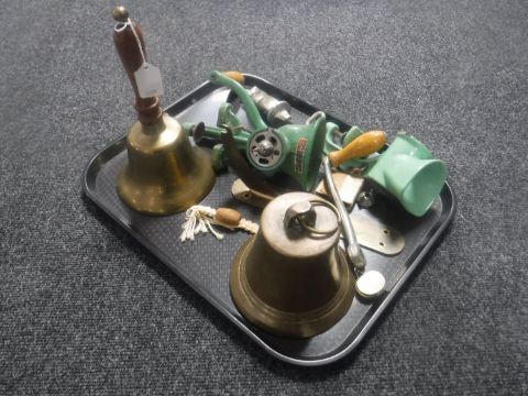 A tray of two mincers, brass hand bell together with a brass ships bell