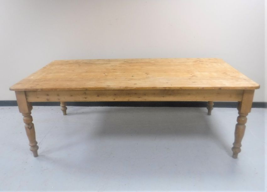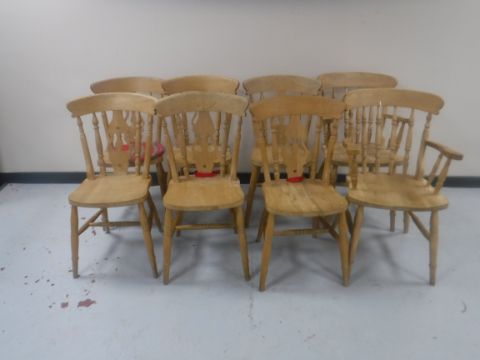 One carver chairs is missing its under stretcher. Otherwise the table and chairs are all in good condition. Typical fading and watermarks to table. Table legs with typical minor dents and scuffs. The table is 227cm long, 122cm wide and 80cm high.