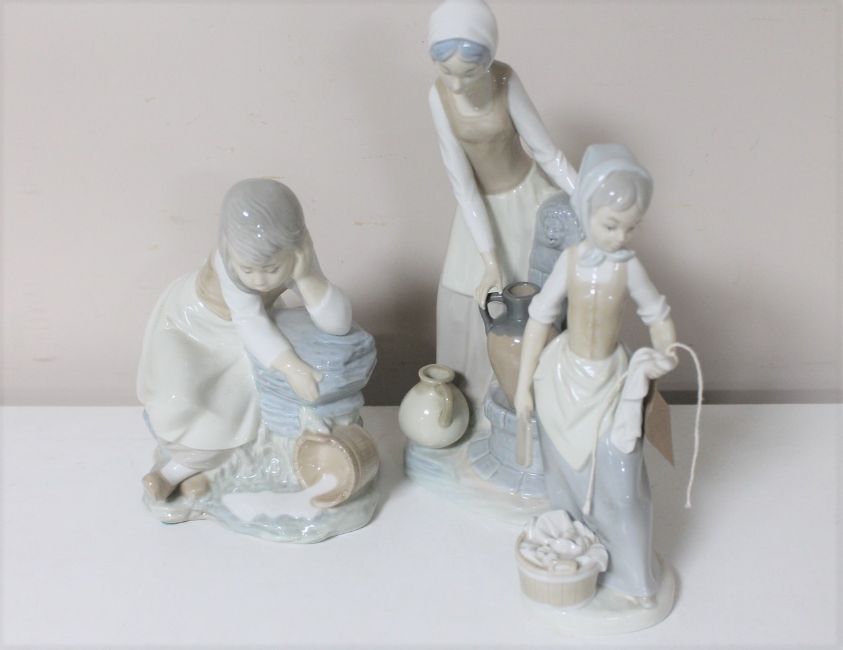 Three Nao figures; lady filling urn at well, girl with spilt milk and wash lady