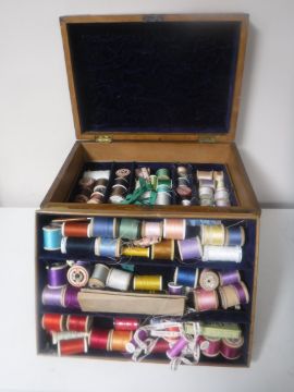 A Victorian pine workbox containing four lift out trays of sewing items and threads