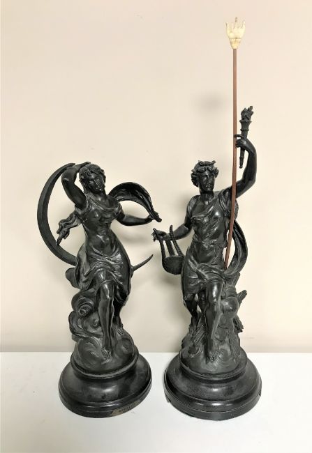 A pair of antique spelter figures on wooden bases