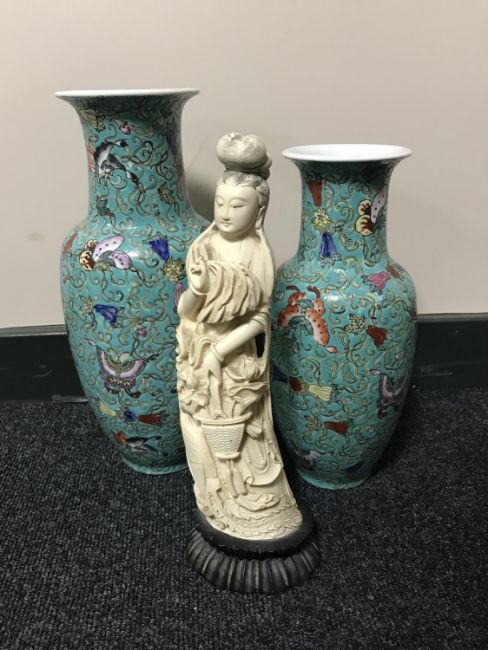Two Japanese porcelain vases decorated with butterflies, carved resin figure of Guanyin wooden stand
