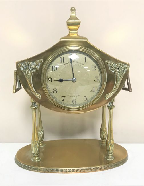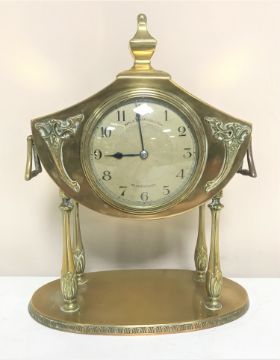 A French brass Art Nouveau mantel clock on raised legs, with key