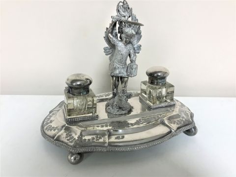 An antique silver plated figural inkstand with two inkwells, depicting St. George slaying a dragon