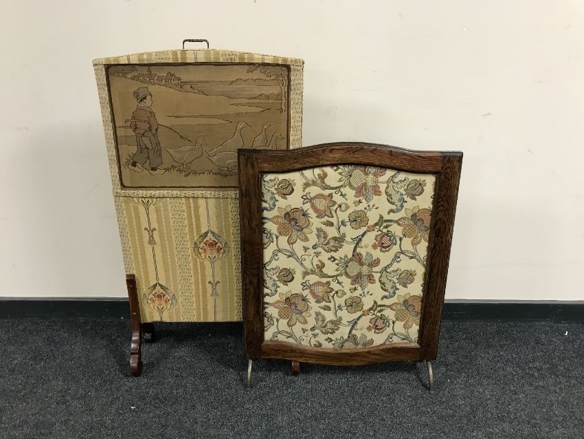 An early twentieth century oak tapestry fire screen together with an Arts and Crafts screen