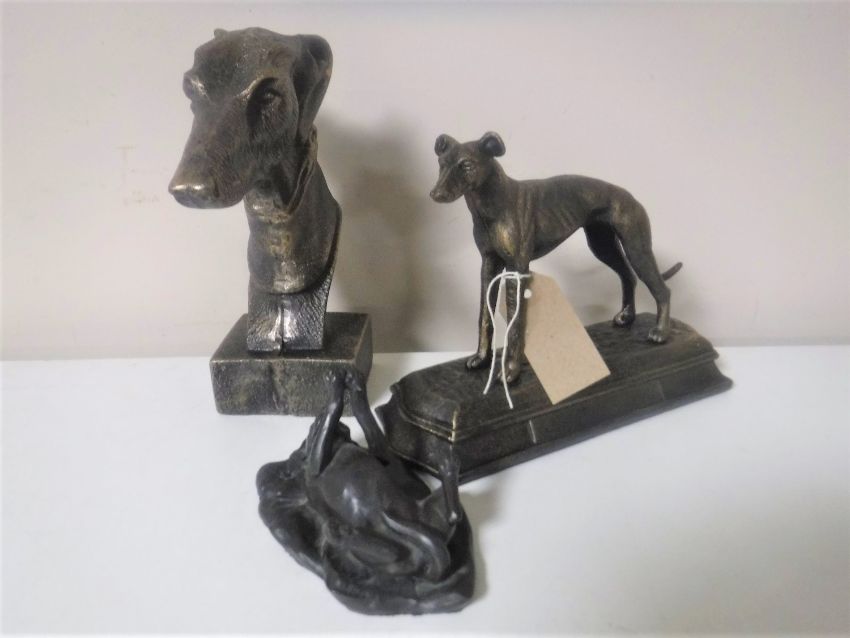 Two cast iron figures of greyhounds and a figure of puppy