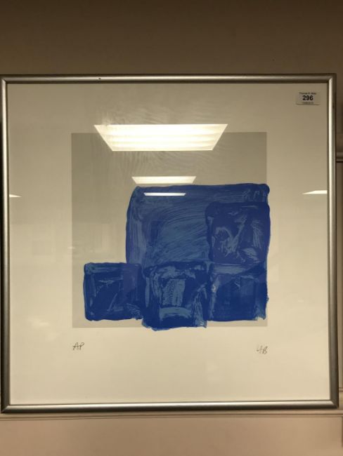 Helen Baker : Abstract Study in Blue and Grey, screenprint, an artist's proof, signed with initials, 49 cm x 49 cm, framed.