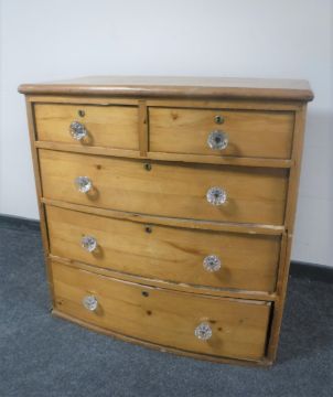 A Victorian pine bow-fronted five drawer chest with glass handles