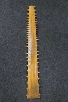 An impressive late 19th/early 20th century taxidermy sawfish rostrum, with sixty-five teeth, length 110cm, width 13.5cm at the base. *** With CITES certificate No. 583226/01 for commercial activities.