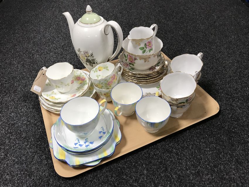 A tray containing Myott Clarice Cliff teapot, fifteen pieces of Royal Standard bone china, three Royal Grafton Deco trios and three further Victorian china trios