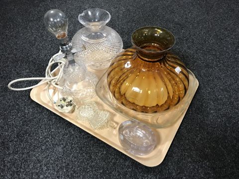 A tray of assorted glass ware to include amber glass oil lamp shade, cut glass table lamp with shade (a/f) and four further glass dishes