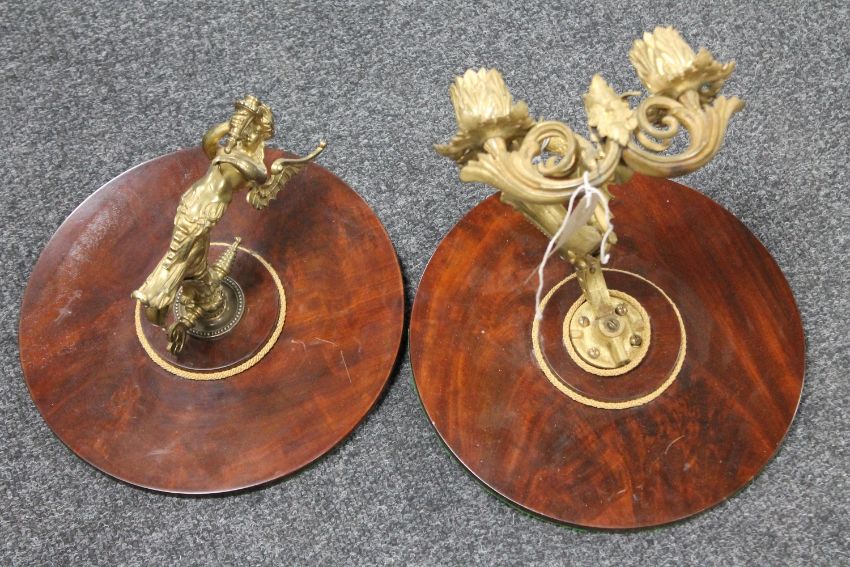 An antique brass figural sconce in the from of a winged man, mounted on circular mahogany plaque, together with a further ornate brass two-way candle sconce on circular mahogany plaque