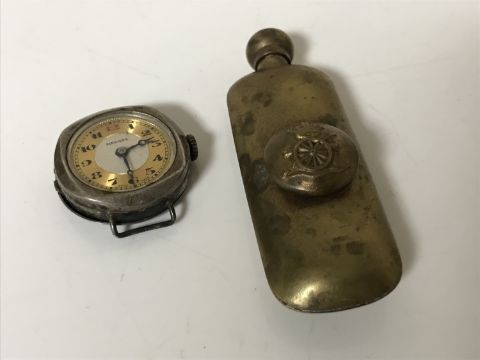 A WWI brass artillery oiler together with a WWI silver trench watch