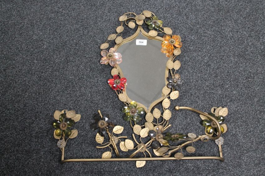 An ornate five-piece metal ware bathroom set, decorated with flowers and leaves, comprising a towel rail, a toilet roll holder, two door hooks and a shield-shaped mirror. (5)