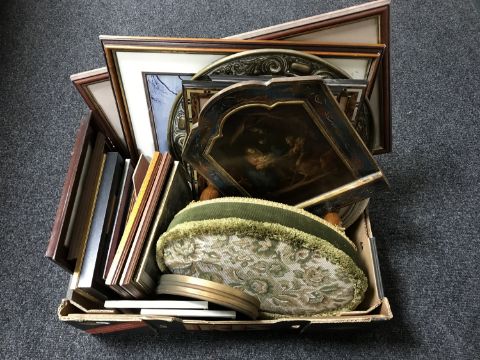 A box of assorted pictures and prints, religious icon, tapestry footstool, brass wall plaques