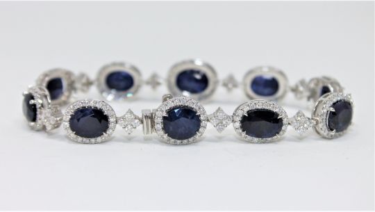 An 18ct white gold sapphire and diamond tennis bracelet featuring 10 oval cut Kashmiri sapphires 24.08ct with 40 round brilliant cut diamonds 1.09ct and 212 round brilliant cut diamonds 1.985ct.