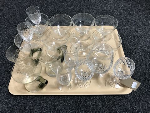 A tray of assorted drinking glasses, six etched glass grapefruit dishes