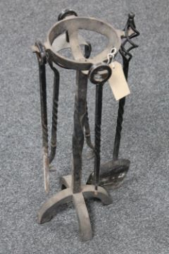 An antique three piece cast iron companion set on stand together with a coal shovel