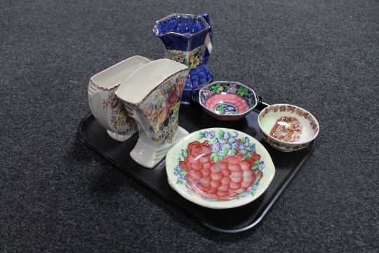 A tray of seven pieces of Maling lustre pottery to include to Rosalind pattern vases, blue springtime jug etc