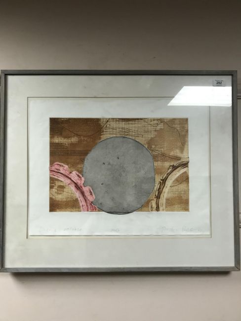 Mid 20'th Century School : Chania Eclipse, etching in colours, a proof, indistinctly signed, with margins, 40 cm x 54 cm, framed.