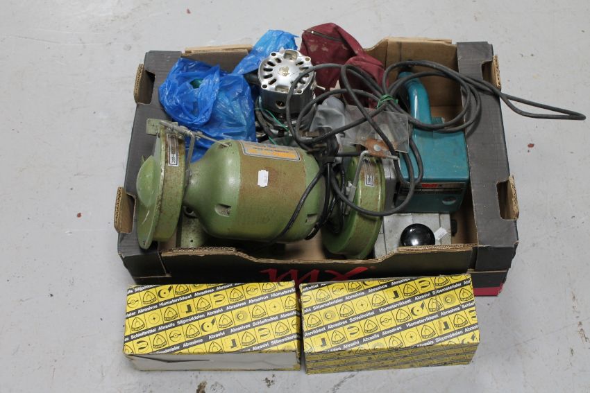A box containing power tools including Black & Decker jigsaw, Wolf belt sander with pads, router together with an Multico bench grinder and three boxes containing 12" bolts with nuts