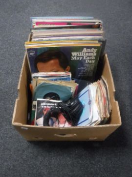 A box containing vinyl LP's and 7" singles, easy listening etc together with a set of headphones