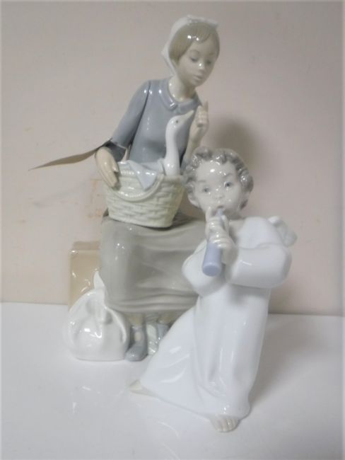 A Lladro figure of an angel together with a Nao figure of a seated lady with duck in basket