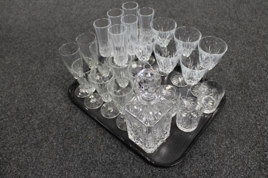 A tray of assorted glass ware to include a lead crystal whisky decanter together with three lead crystal whisky glasses, assorted wine glasses and champagne flutes