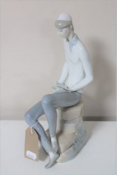 A Lladro figure of a man seated on a rock reading a book