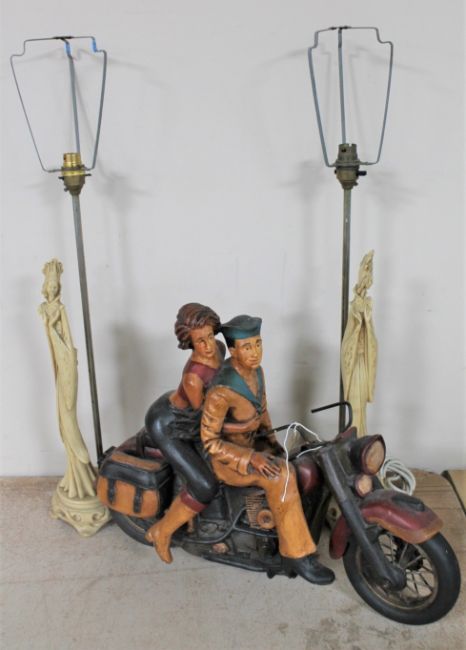 A wooden figure of an American sailor with girl on motorbike and two Eastern resin figural table lamps