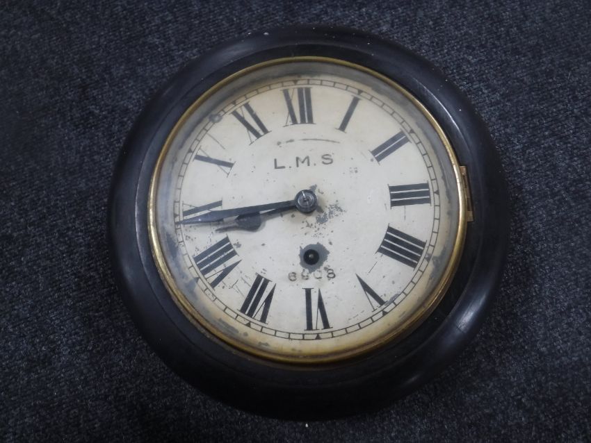 An early 20th century L.M.S. station clock with Enfield movement, pendulum and key