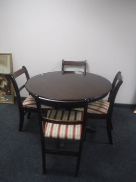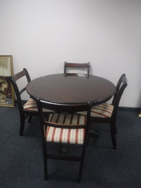 A circular inlaid mahogany Regency style pedestal dining table with four chairs