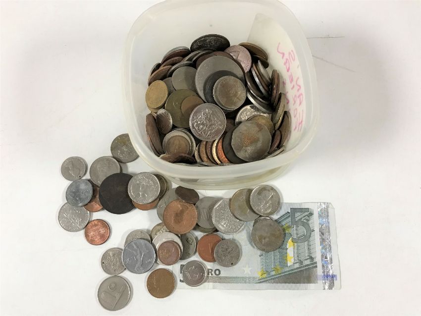 A tub containing pre-decimal British coinage, foreign coins including America, Australia, 5 Euro note