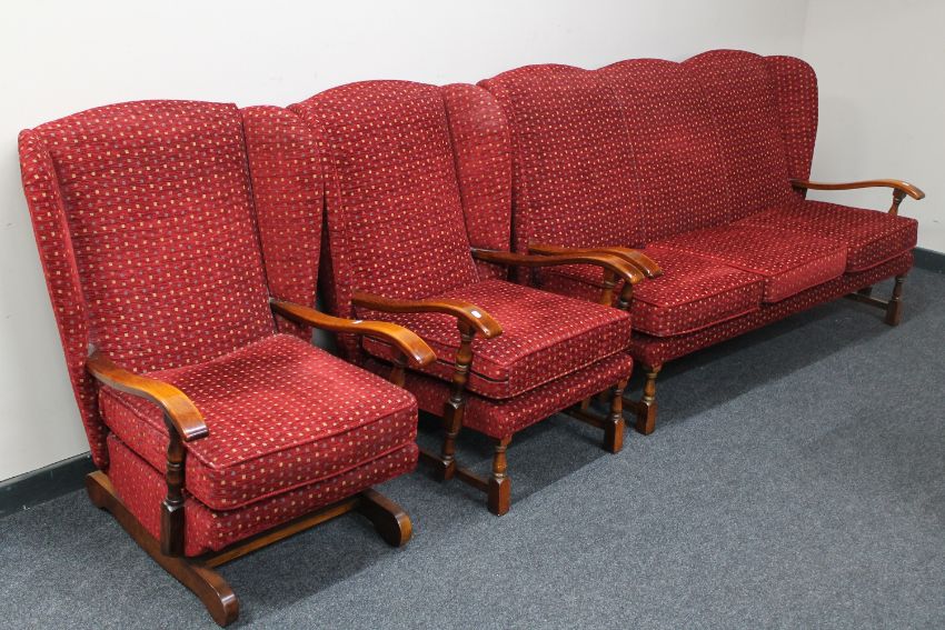 A three piece wood framed wingback lounge suite upholstered in a red fabric comprising of three seater settee, armchair and rocking chair