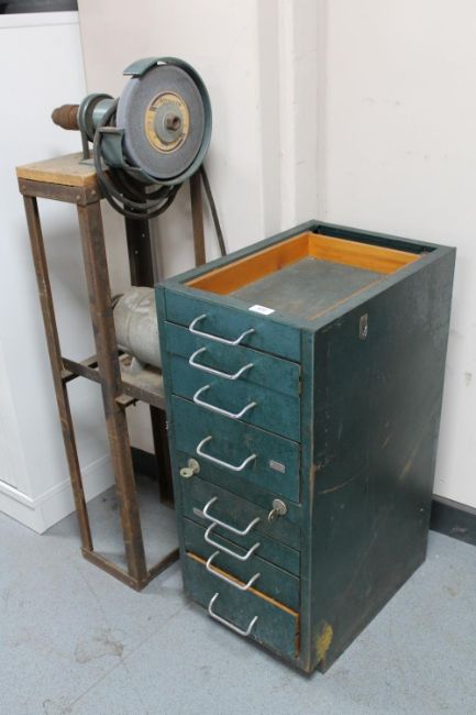 An industrial metal eight drawer chest together with an electric grinder on metal stand