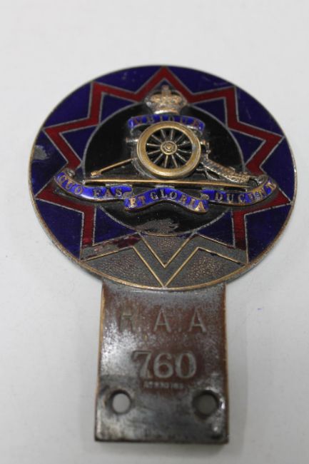 A vintage R.A.A. car badge, number 760, registration 830873