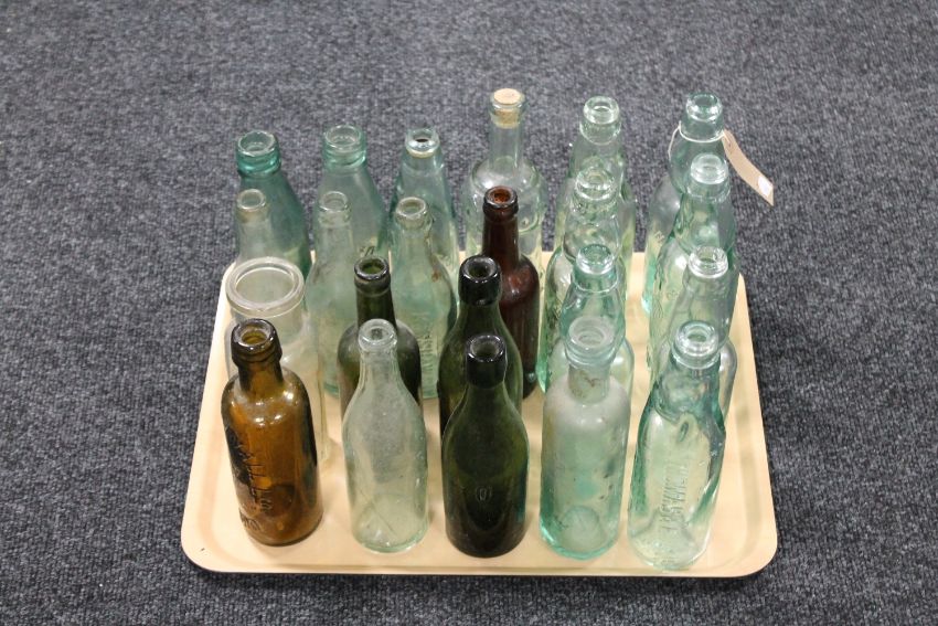 A tray of twenty assorted antique glass bottles and jars, many bearing advertising, including several clear glass Codd bottles