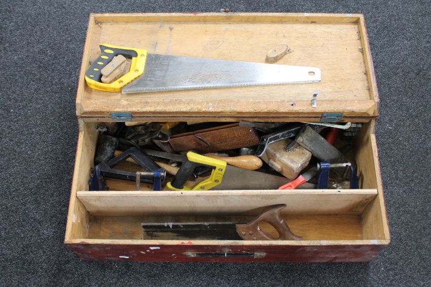 A mid 20th century plywood tool box containing joiners tools