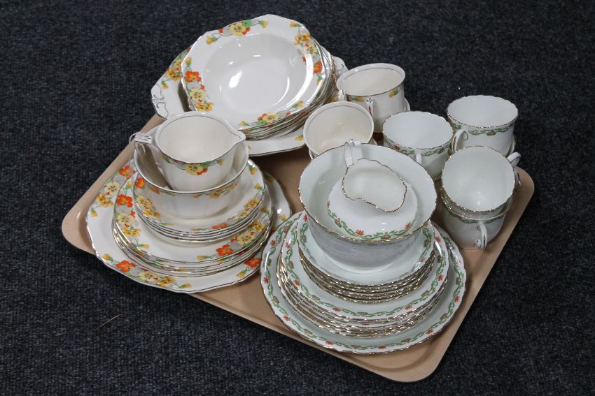 A tray containing a twenty-one piece antique china tea service together with fourteen pieces of Alfred Meakin tea china and a matching seven piece dessert set